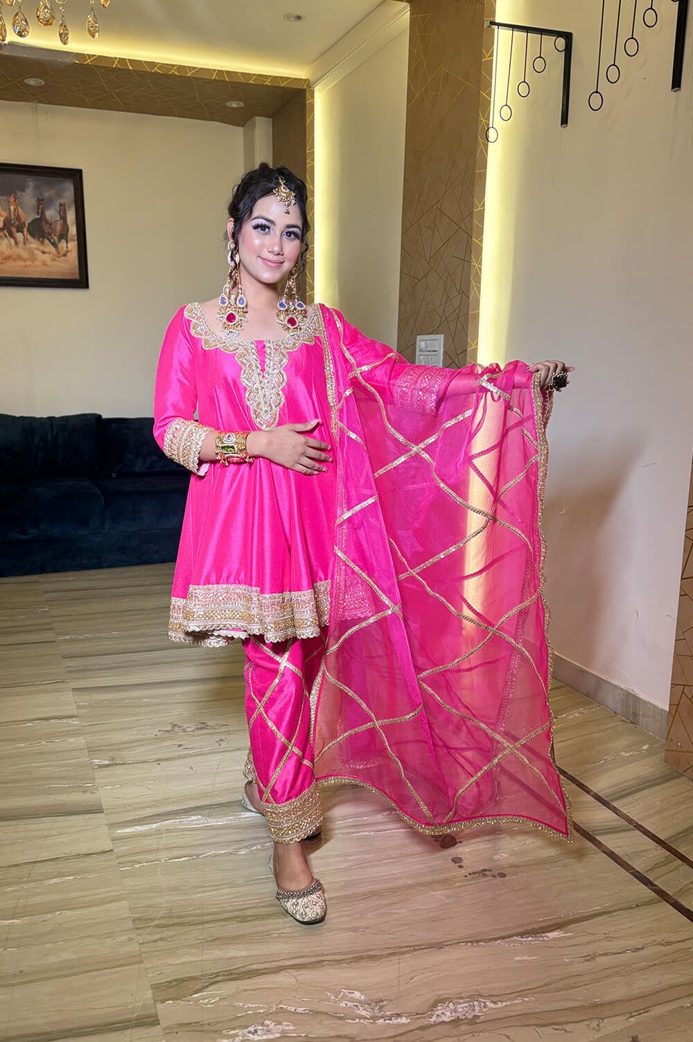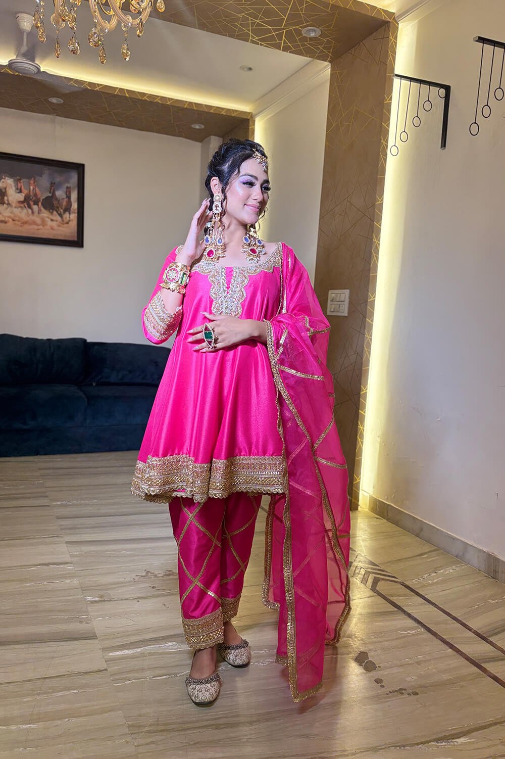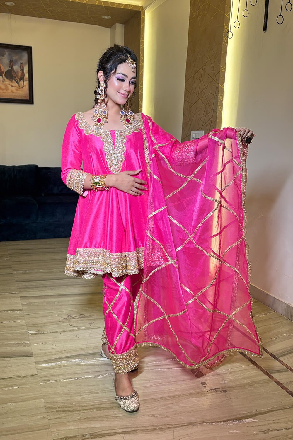 Rani Pink Summer Silk Fabric Short Anarkali With Pants & Organza Dupatta In Hand Embroidered Embellished Laces Detailing . Colours Can Be Customized.